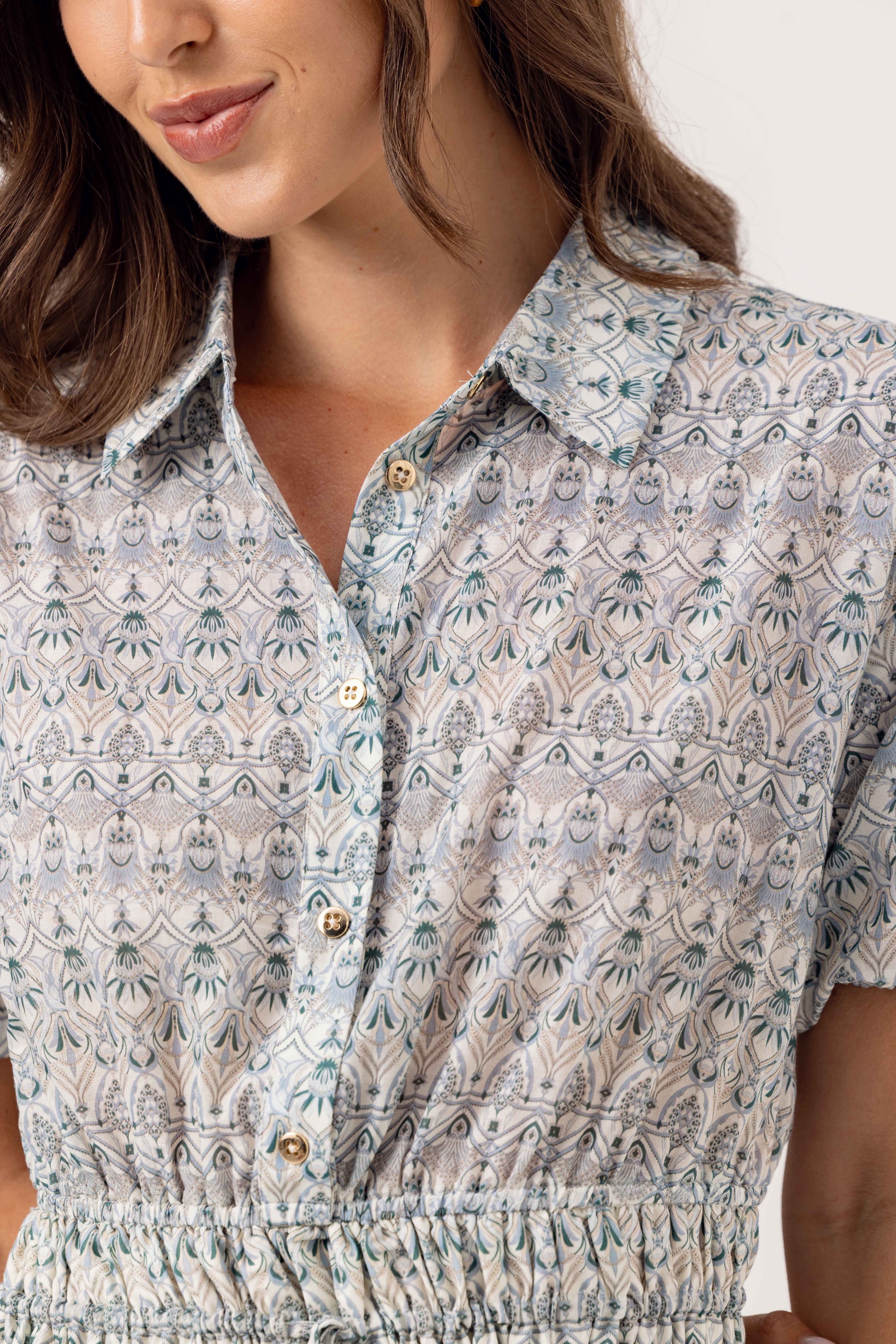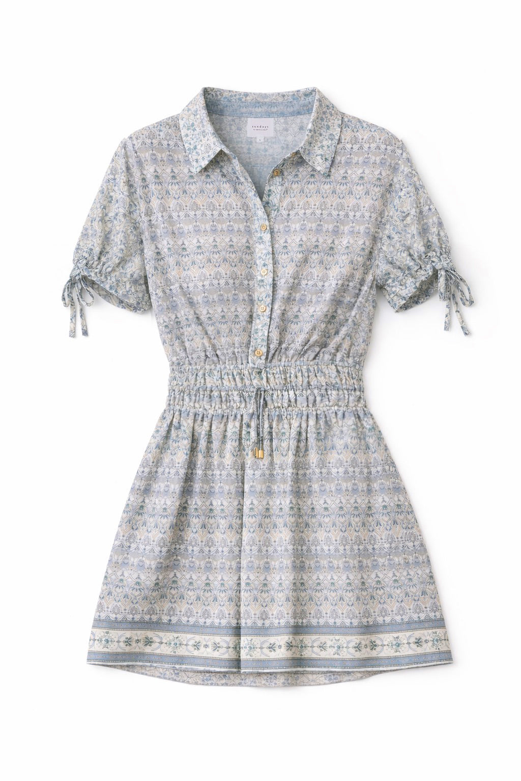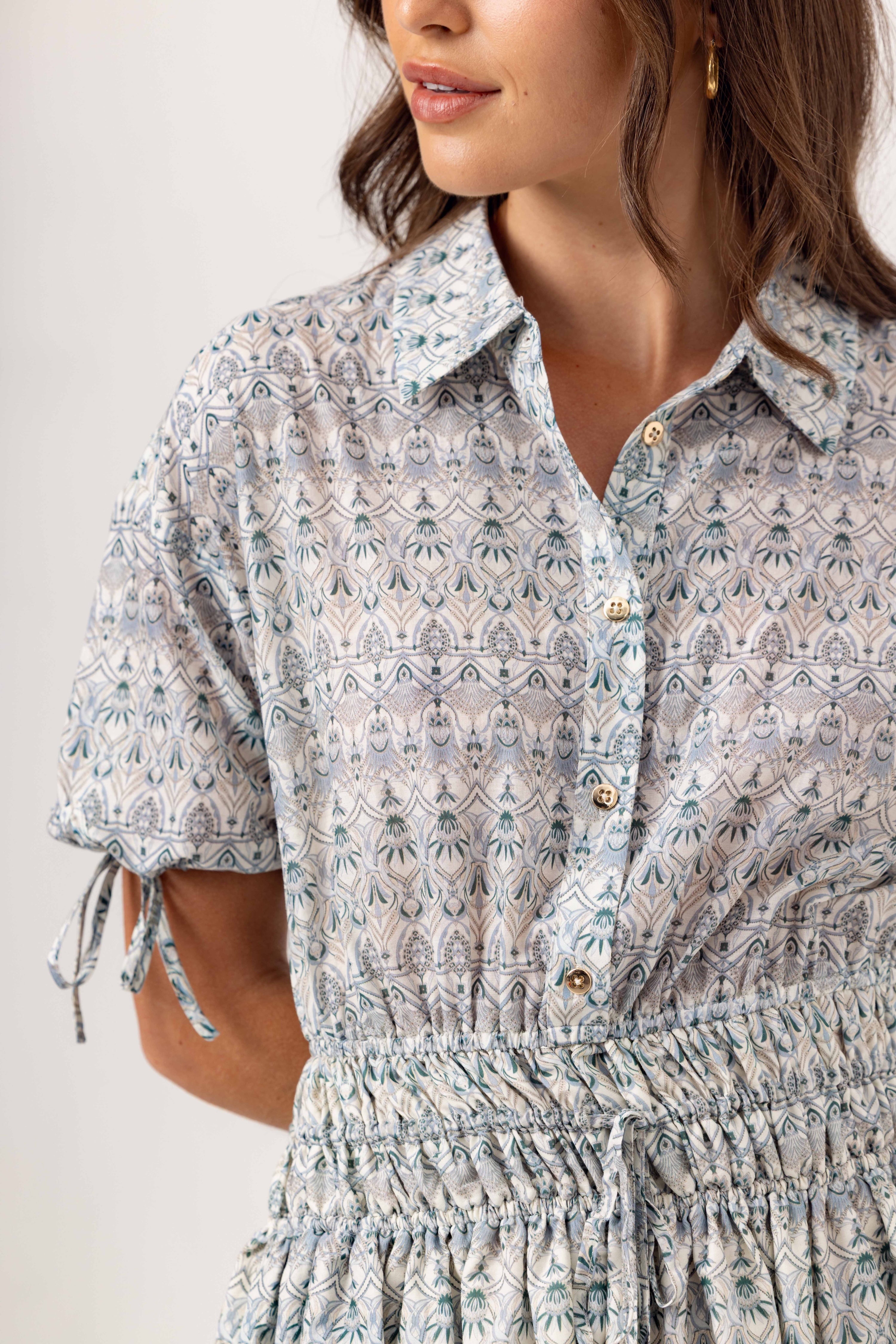 Designed in our Damask Skywash, the print draws inspiration from the intricate floral motifs of traditional zellige tilework. Rendered in a soft, monochromatic palette, the design is framed by a delicately detailed border at the bottom hem and finished with touches of gold seen in the buttons and drawstring finishes. Isana is complete with adjustable ties at the sleeves, a foldover collar, and is lined through the skirt for effortless wear.