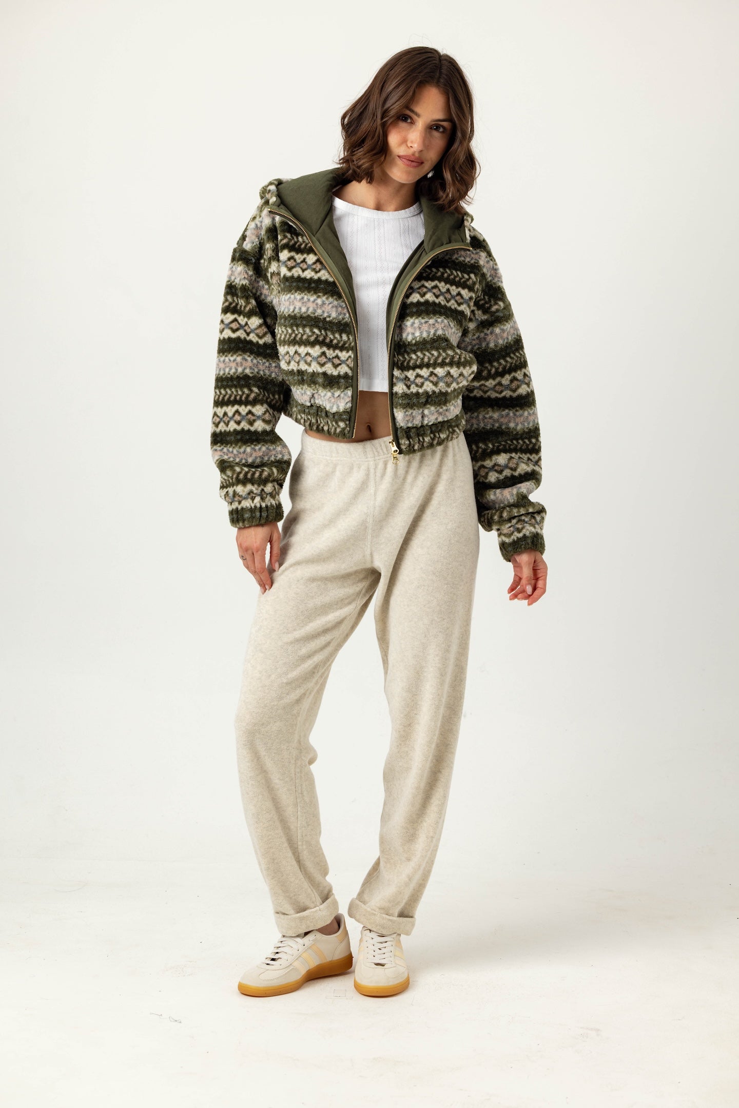 • Fair Isle sherpa in a soft, monochromatic winter pattern