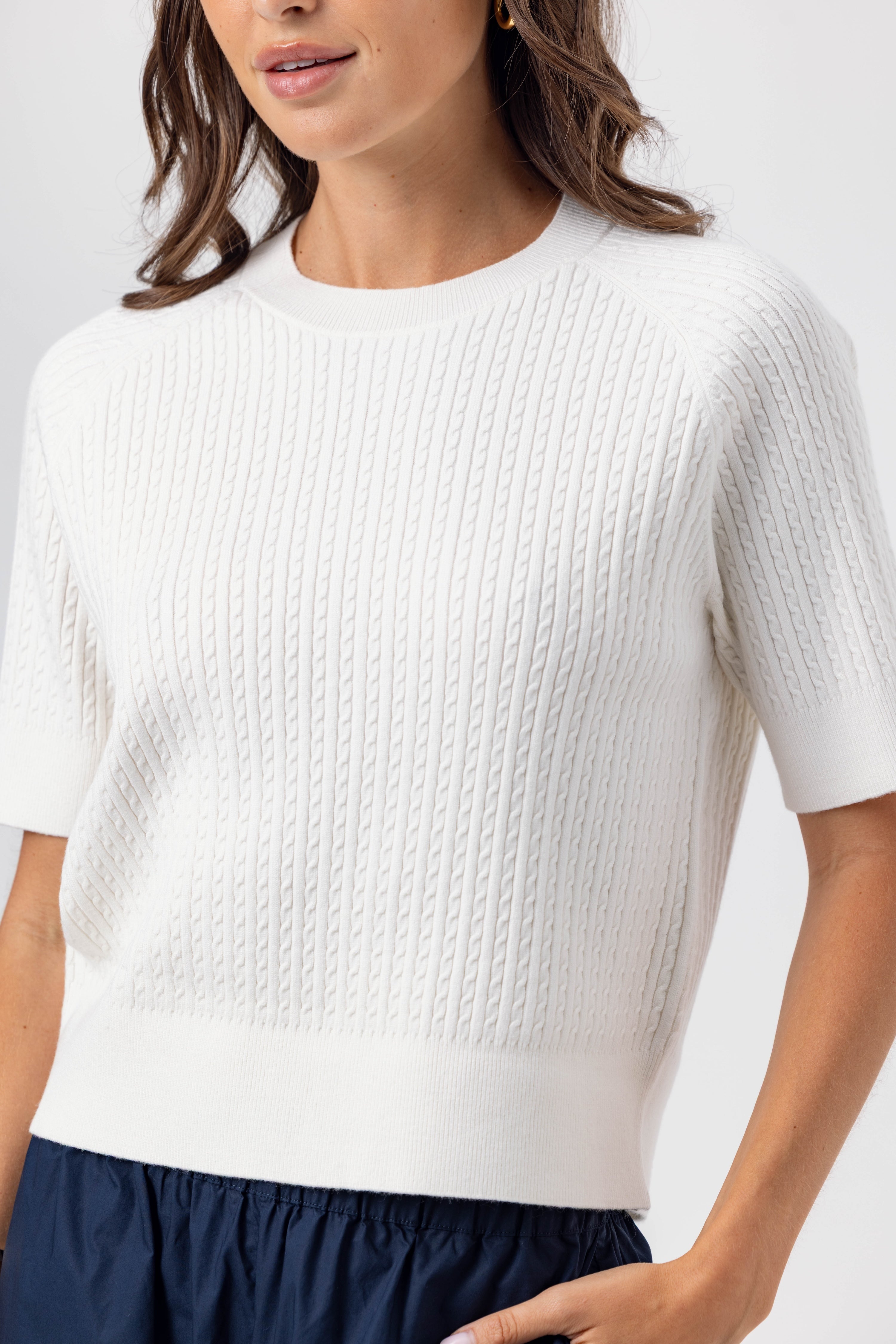 Made from our butter-soft viscose yarn, the Kendra sweater reimagines a classic silhouette with raglan short sleeve, finished with a delicate rib stitch on the sleeves, neckline, and bottom opening.