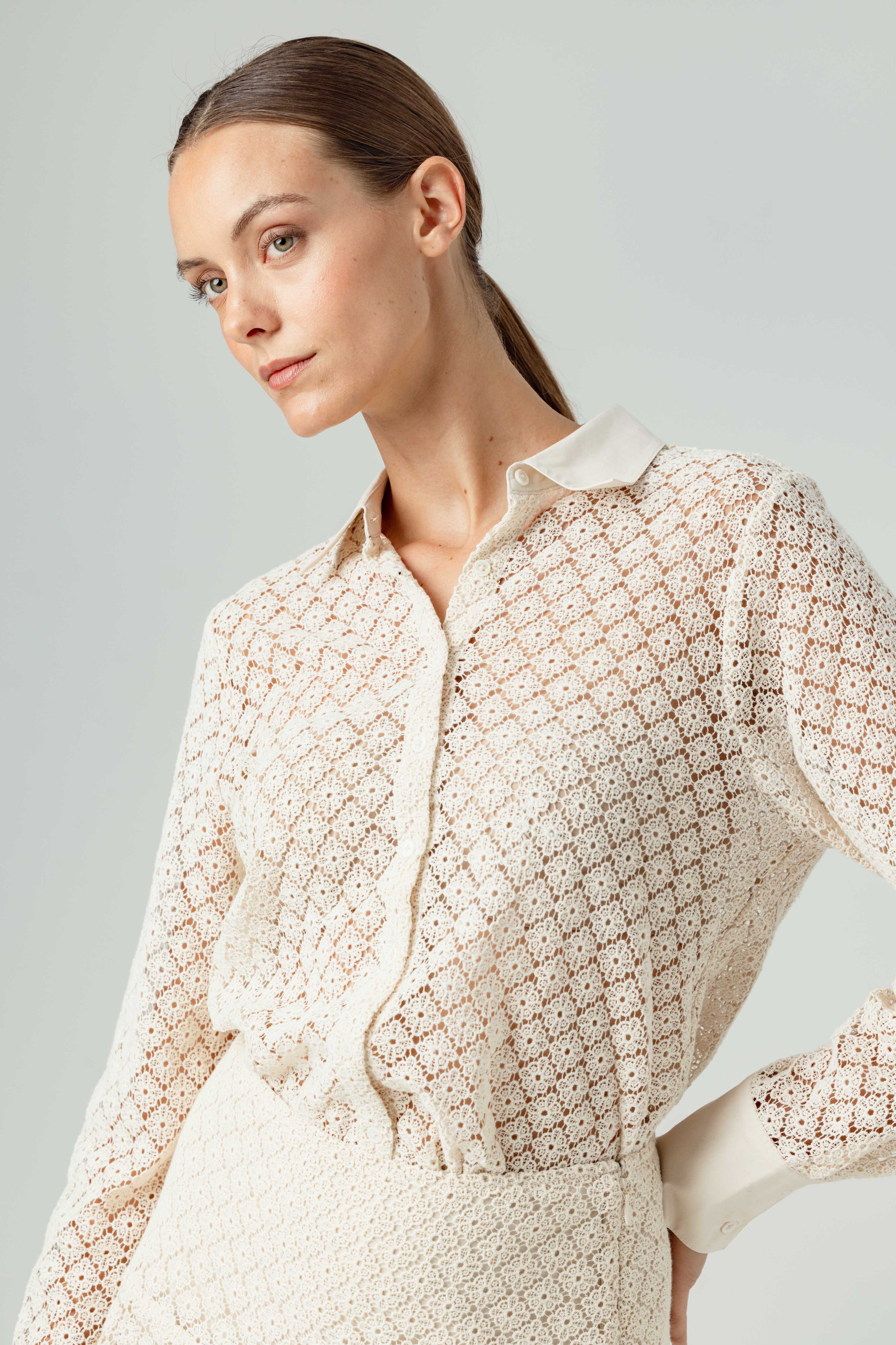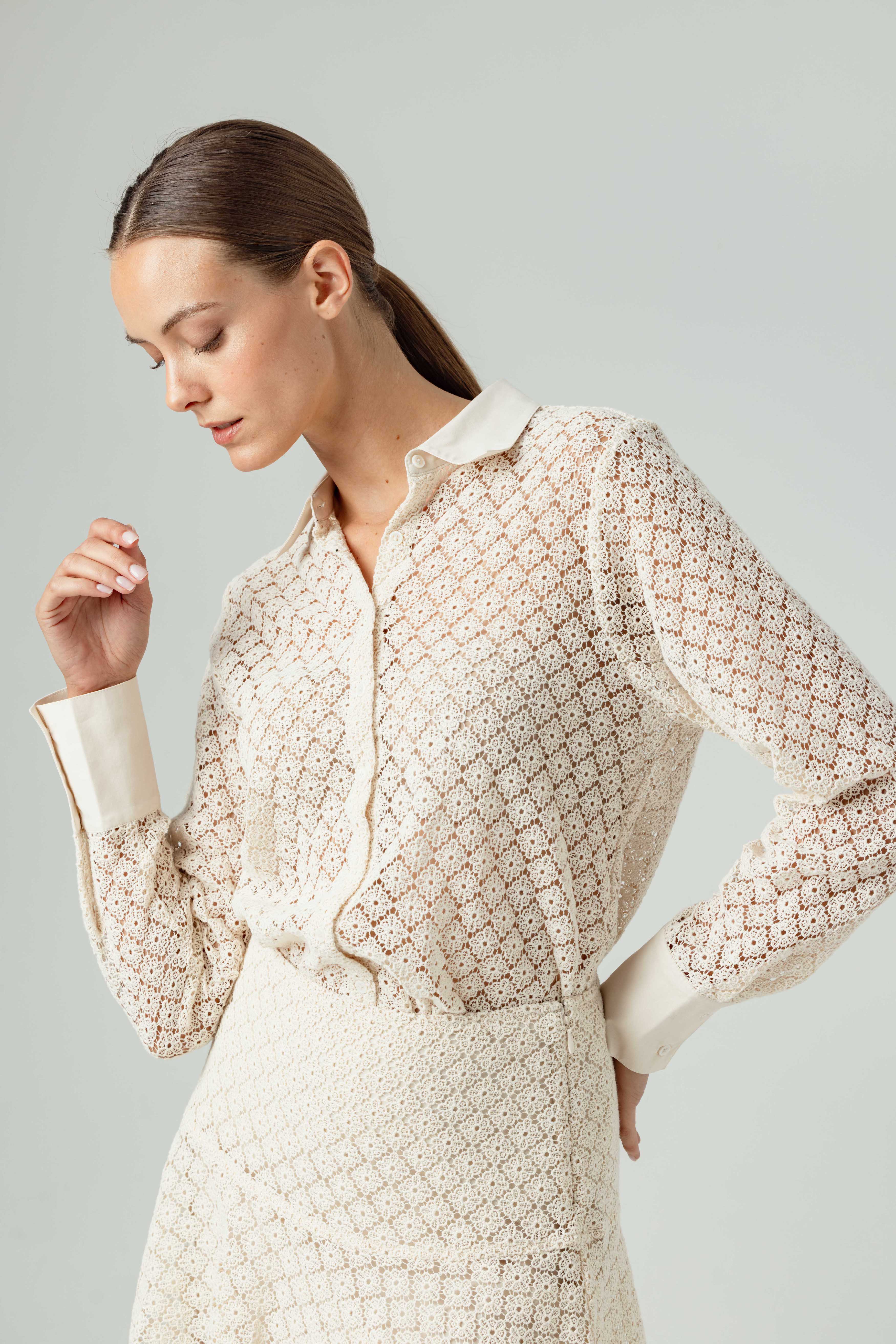 Indulge in elegance with our Reece shirt. Made from lux cotton lace, this feminine twist on the classic button-down features a contrasting poplin collar and a relaxed yet flattering fit through the body. It is perfect for the sophisticated woman who values both tradition and modernity.
