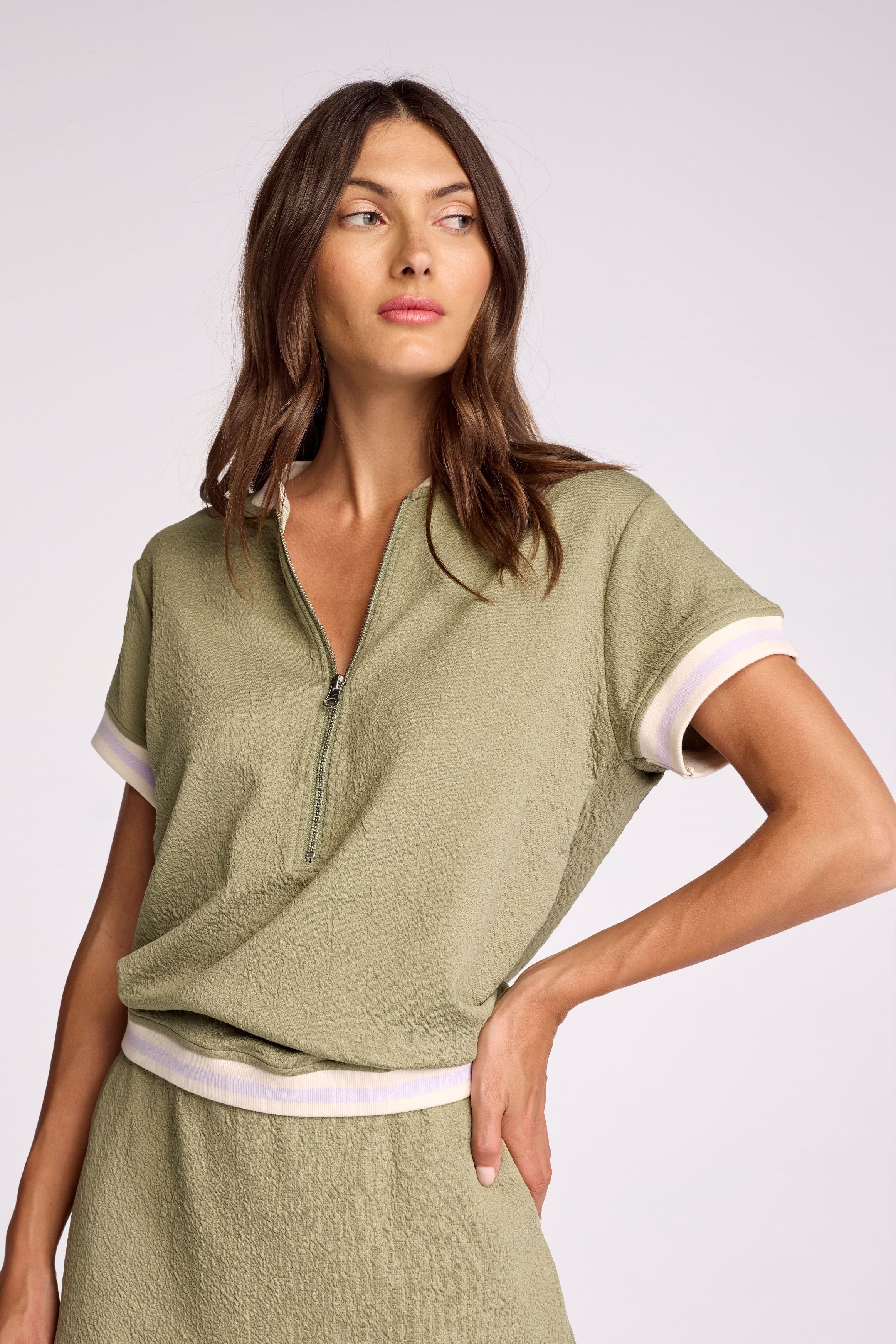 The Isla Pullover is your new go-to. Made in our new crinkle french terry fabric, it has a lux raised textured while still comfortable and easy. This style has a half zip crew neckline, and a sporty stripe accented on the fitted waistband and sleeve trim. Pair it with the Paloma Skirt for the ultimate on-the-go look.