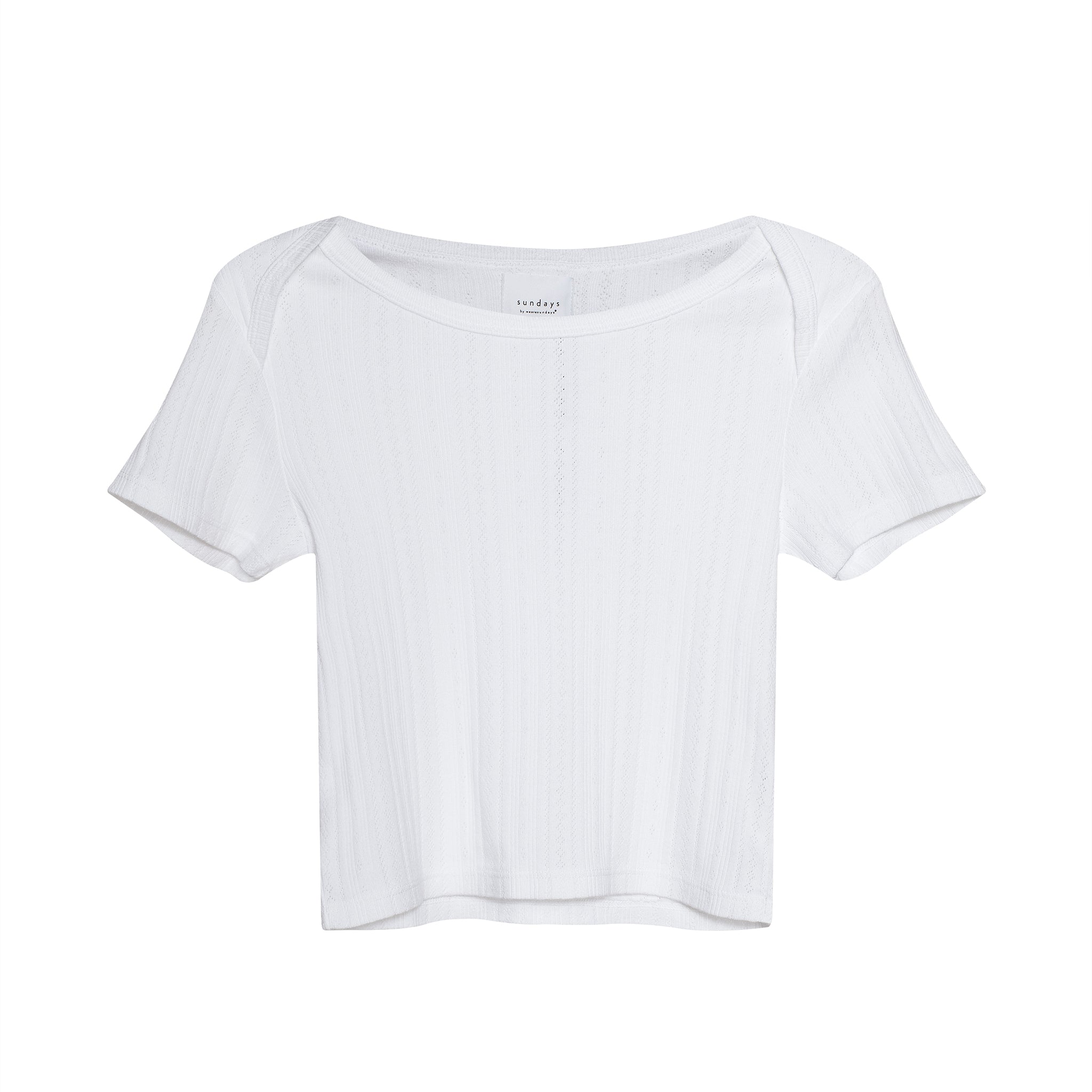 An update to our best-selling Brother Tee, the Pointelle Baby Brother Tee is crafted from a new 100% cotton pointelle fabric, offering a new take on a classic silhouette. It features an overlapping shoulder yoke detail and soft cap sleeves. Finishes right at the belly button with a size small length measuring 16.5in. Complete with a crew neckline, it’s the perfect everyday essential with a delicate touch.