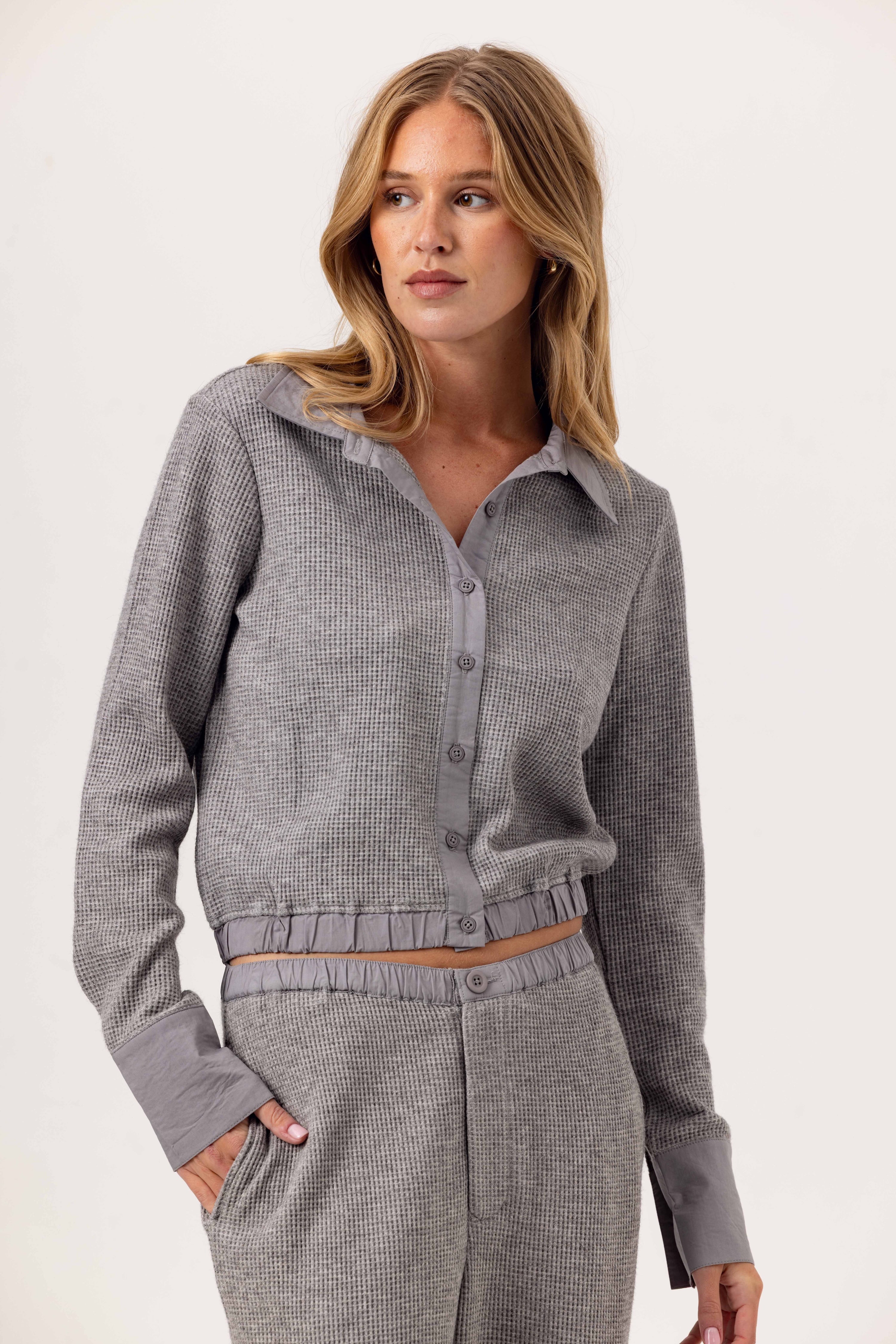 The Nell is a cropped button-up shirt designed with a focus on tactile contrast. It combines our luxe thermal fabric with crisp poplin details for a sophisticated take on a casual staple.