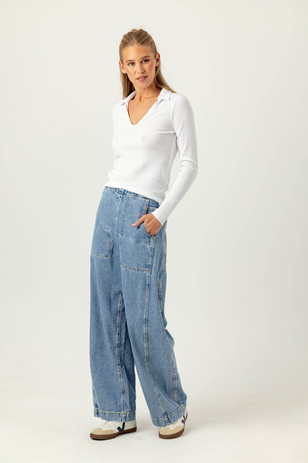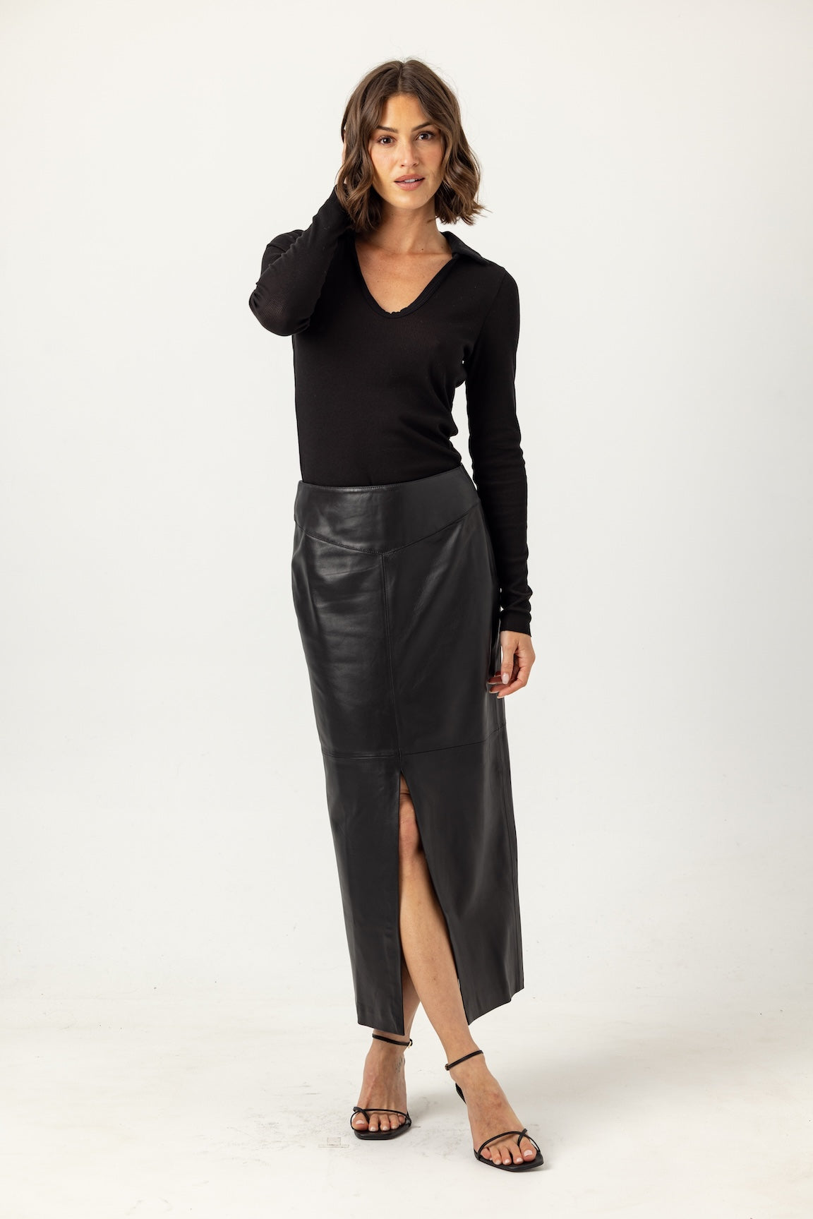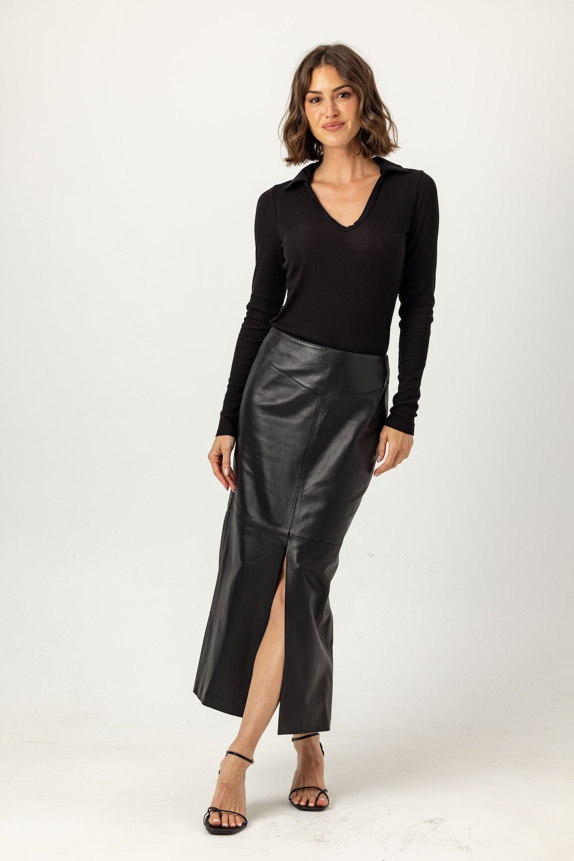 New in our best-selling rib fabric, this elevated take on the classic polo features a contrast jersey collar and a flattering plunging neckline, a soft U-shape with a subtle V. Designed with a tight fit through the body and classic long sleeves, it offers a clean, modern silhouette. The length is perfect for pairing with your favorite mid-rise bottoms, making it a versatile piece for everyday wear. Made, washed, and preshrunk in Los Angeles.