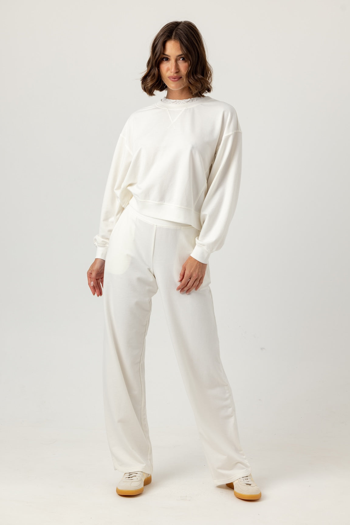 • Our classic wide leg sweatpants updated with lace trim on pockets